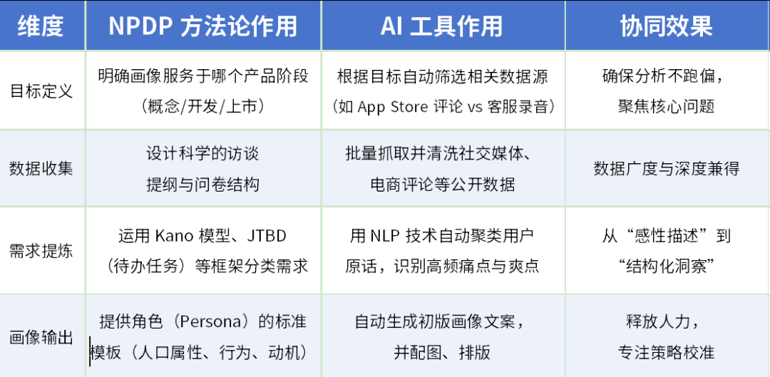 真正的破局点,在于让AI成为NPDP方法论的“超级外挂”。 02 NPDP+AI:打造用户画像的黄金组合 ![]() 结论:NPDP告诉你“做什么”和“为什么”,AI帮你解决“怎么做”和“快一点”。 03 真实场景拆解: 如何用这个组合画出“能打”的用户画像? 【评测目标】为一款新上线的家庭健康监测App,快速构建核心用户画像。 【执行步骤】 1.用NPDP定方向:明确画像目标是“验证早期种子用户的付费意愿”,锁定“45-60岁关注慢病管理的中产家庭”。 2.用AI收数据:输入提示词:“分析近3个月关于‘家用血压计’‘老人健康APP’的知乎问答和小红书笔记,提取用户抱怨与期待。” 3. 用NPDP析需求:将AI提炼出的200+条原始语句,按“基本型/期望型/兴奋型”需求分类。 4. 用AI出初稿:指令:“基于以上需求,生成一个名为‘李阿姨’的用户画像,包含基本信息、健康焦虑、科技使用习惯、购买决策因素。” 【结果】